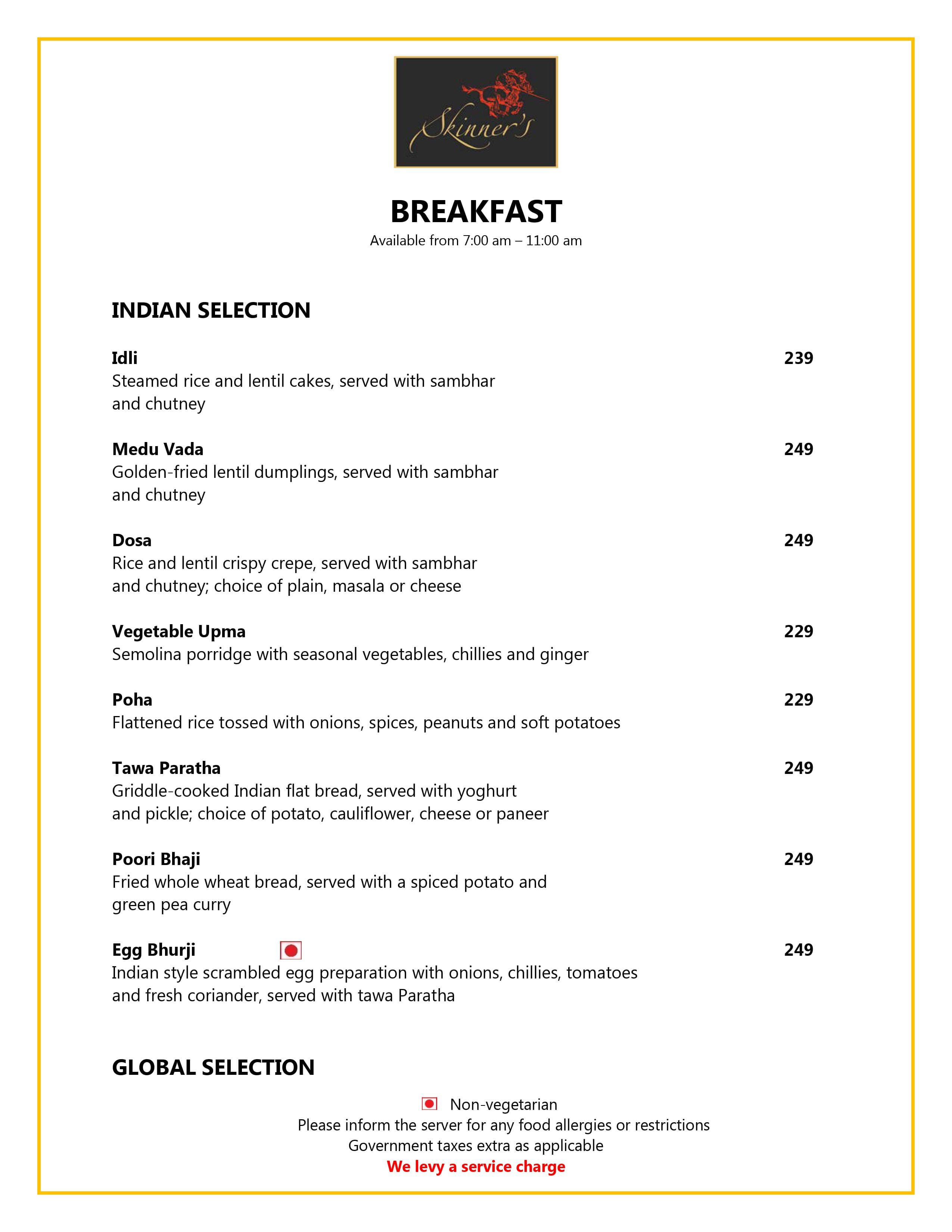 Skinners offers a multi-cuisine menu that includes Indian, European, American, and pan-Asian dishes. You can enjoy a diverse range of flavors and culinary styles in one place.
